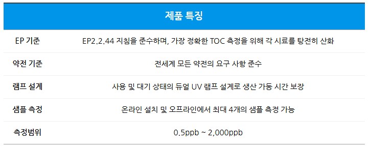 EP2.2.44 기준에 맞춰 가장 정확한 TOC 측정이 가능하며, 모든 국제 규제 요구 사항을 충족하도록 설계되었습니다.