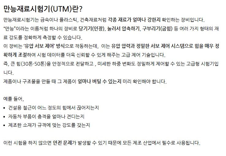 유압 서보 제어 시스템을 적용하여 정밀한 하중 제어와 안정적 실험 반복성이 보장됩니다.