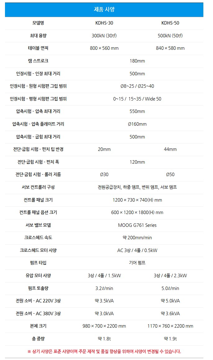 품명 KDHS시리즈 유압 서보식 만능재료시험기는 금속 및 다양한 소재의 인장·압축·굽힘 시험을 수행하는 고정밀 장비로, 300kN·500kN 등급의 안정적인 서보 제어 성능을 제공합니다.