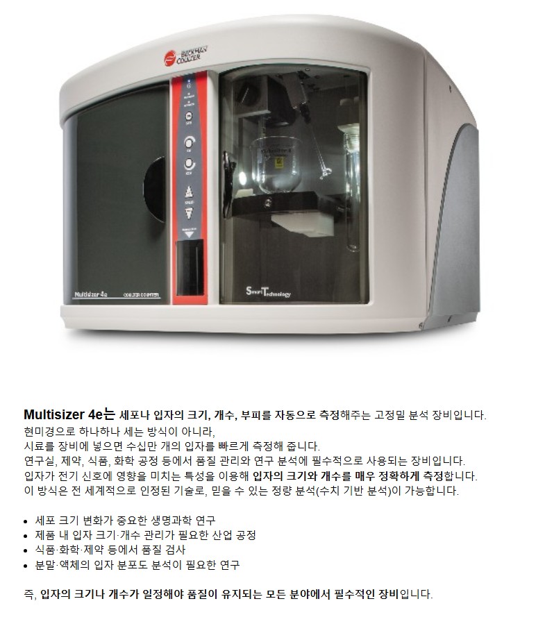 품명 Multisizer 4e는 Coulter 원리를 이용해 세포와 입자의 크기·부피·개수를 고정밀 분석하는 장비로, 다양한 시료의 입자 분포를 정확하게 측정할 수 있는 연구·산업용 파티클 카운터입니다.