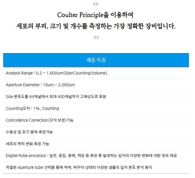 Multisizer 4e는 Coulter Principle을 기반으로 세포 및 다양한 입자의 부피, 크기, 개수를 정밀하게 측정할 수 있는 고성능 장비입니다.