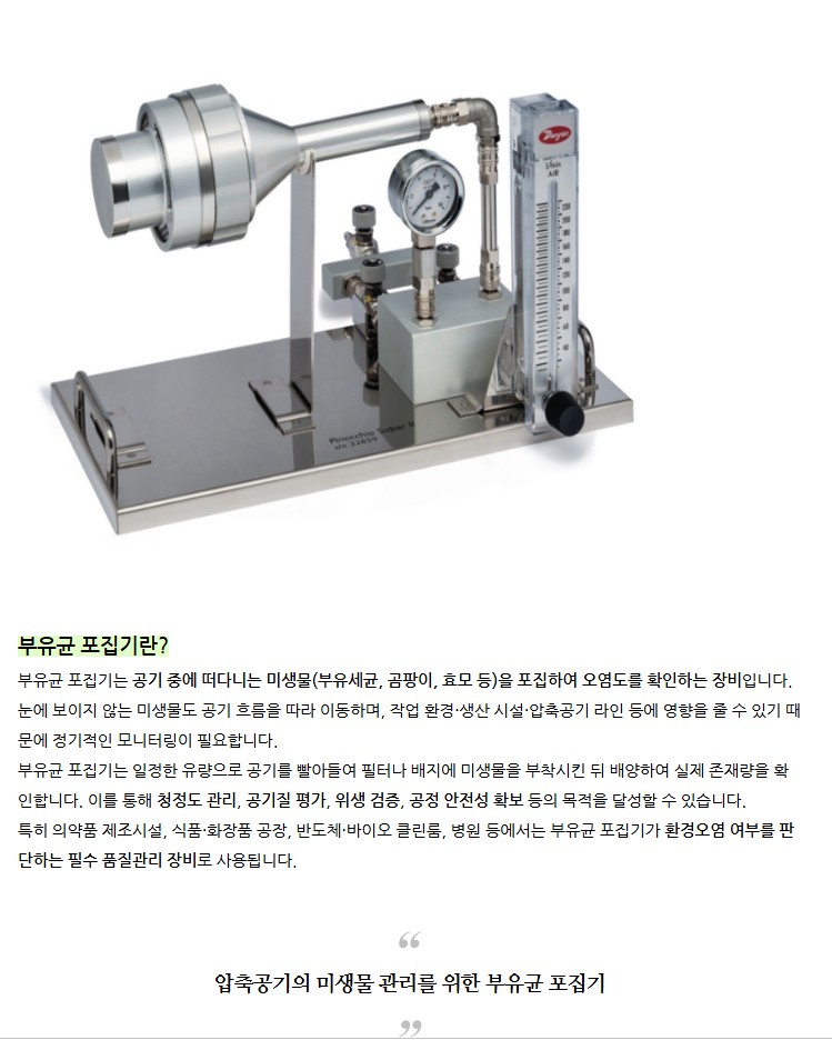 부유균 포집기 유량계 압력계 적용 압축공기 미생물 포집 미생물 관리 장비