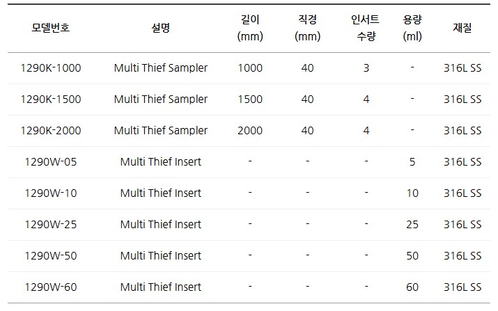 샘플러 본체와 인서트는 개별 구매 가능하며, 품질검사·식품·제약 등 다양한 산업 분야의 샘플링에 적합합니다.