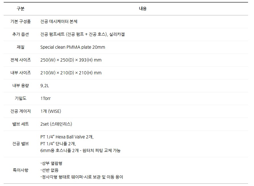 옵션으로 내부 전원 포트진공 펌프세트실리카겔 캔 등을 추가 구성할 수 있습니다.