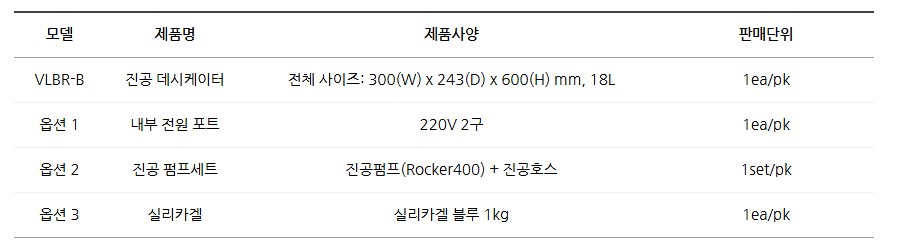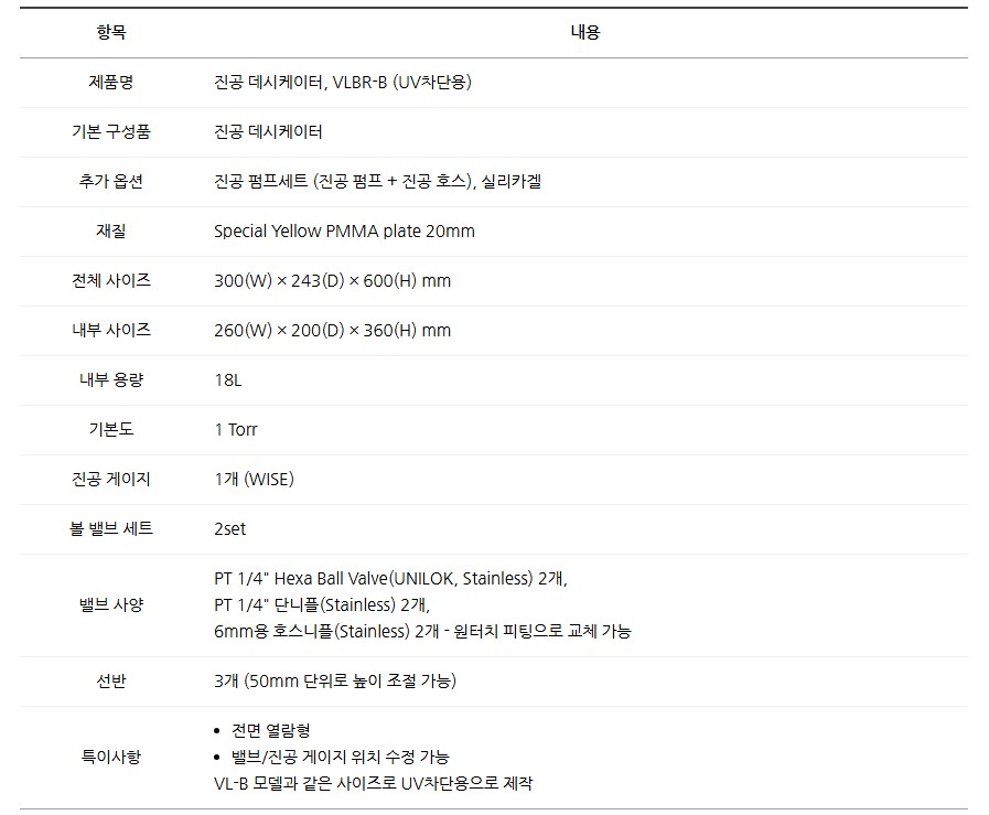 품명 국내 제작 UV차단 전광 데시케이터 VLBR-B, 18L 용량, 1Torr 진공 유지, 옵션 선택 가능, 연구실 시료 보관 최적.