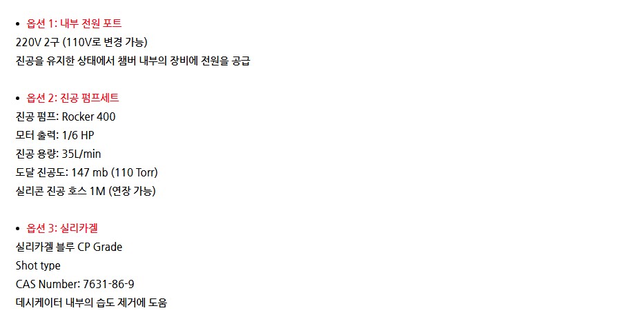 또한, 옵션 선택을 통해 내부 전원 포트, 진공 펌프세트, 실리카겔 추가 구성이 가능하여 연구 목적에 맞춰 확장할 수 있습니다.