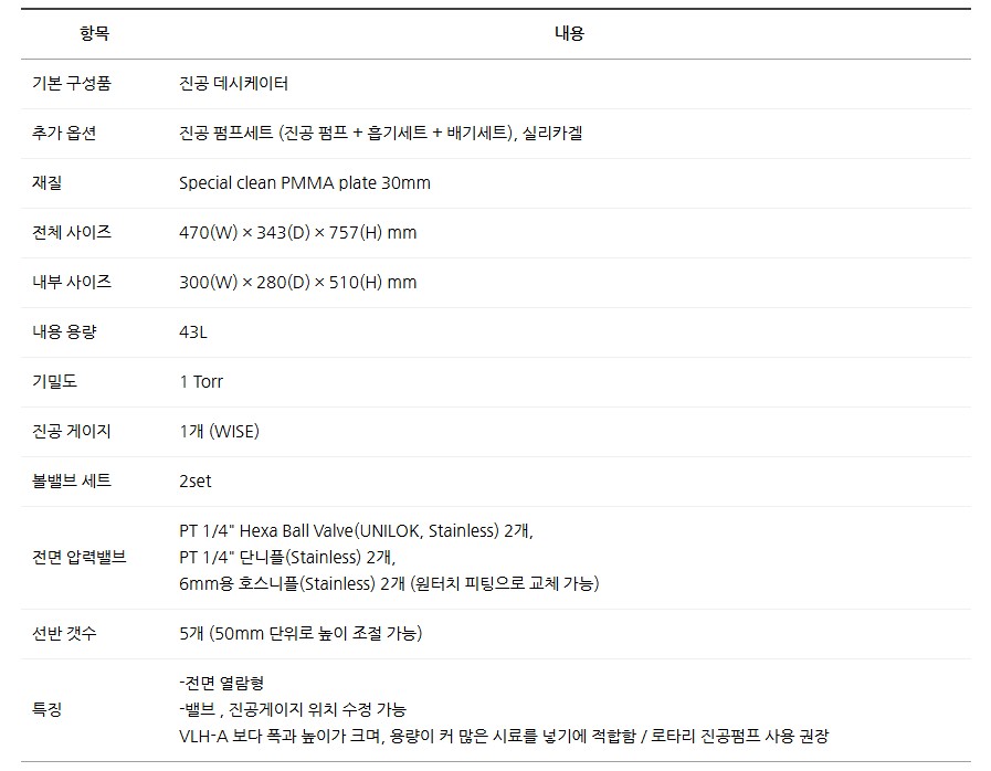 품명 대형 진공 데시케이터 VLH-B, 최대 43L 용량과 1.0 torr 진공 성능으로 연구소·산업체 시료 보관에 최적화된 장비