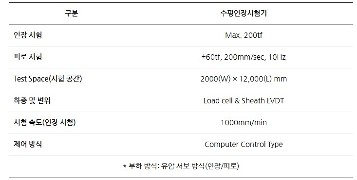 유압 방식의 강력한 하중 제어를 통해 최대 200tf의 인장 시험이 가능하며, 대형 구조물의 파괴 시험 및 반복 피로 시험에 적합합니다.