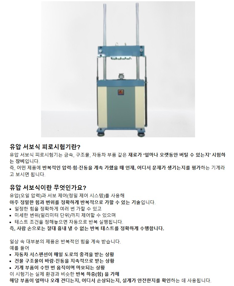 품명 KDPI-170 Series는 금속·구조물·자동차 부품의 반복하중 특성을 정밀하게 측정하는 유압 서보식 피로시험기로, 하중·변위·스트레인 제어가 가능한 고정밀 내구 시험 장비입니다.