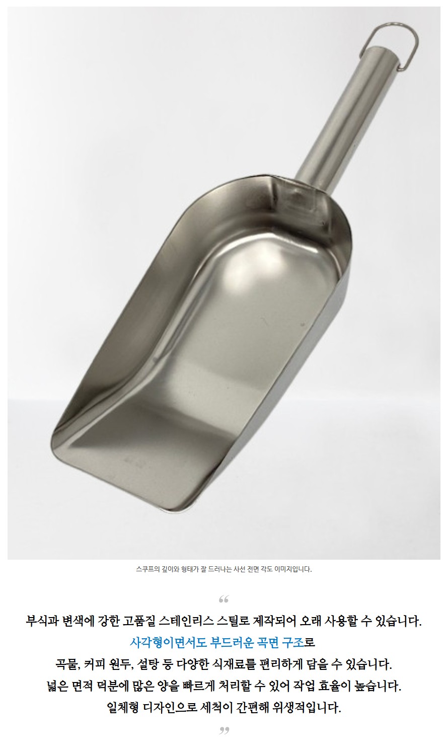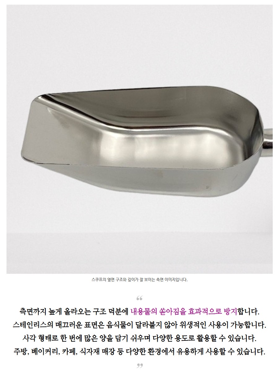 품명 고급 스테인리스로 제작된 사각 스쿠프로 위생적이고 내구성이 뛰어나며 곡물, 얼음, 커피 원두 등 다양한 재료를 효율적으로 덜어 사용할 수 있습니다.