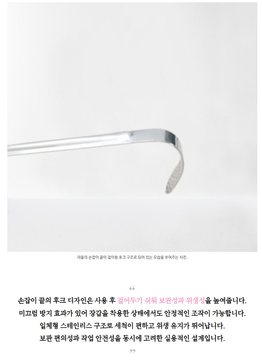 긴 손잡이 구조로 깊은 용기에서도 편리하게 사용할 수 있으며, 손잡이 끝의 고리형 디자인으로 보관 또한 쉽습니다.