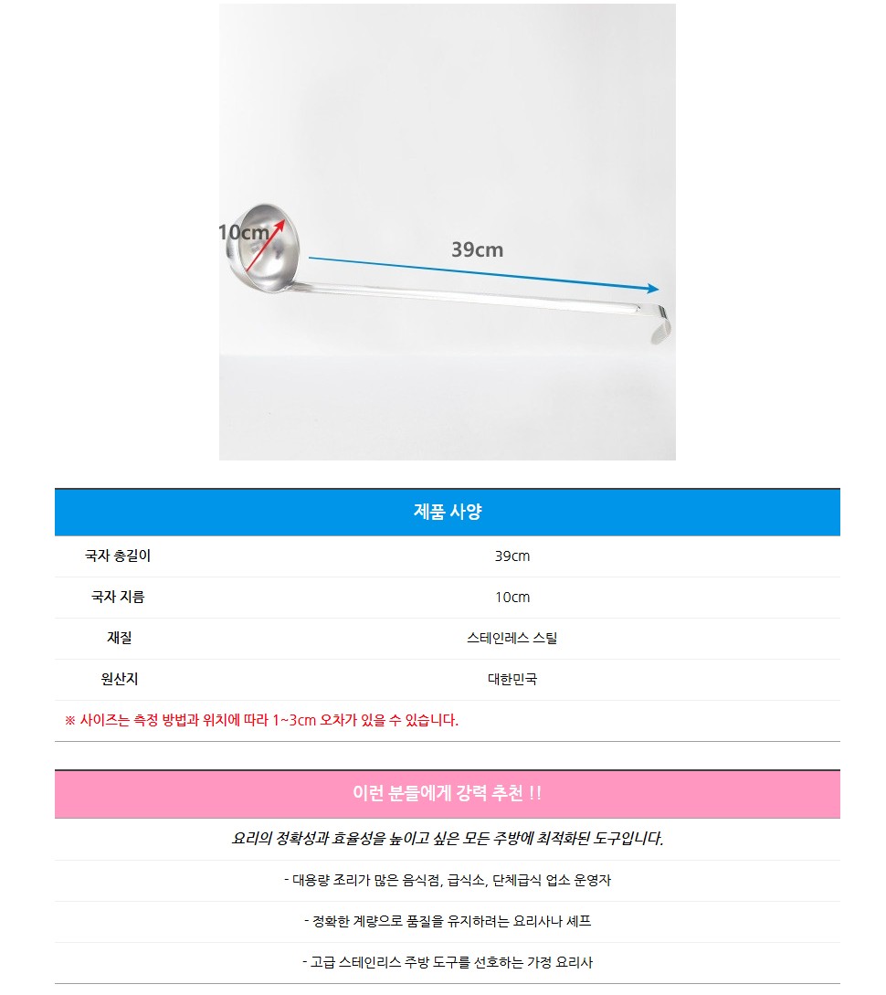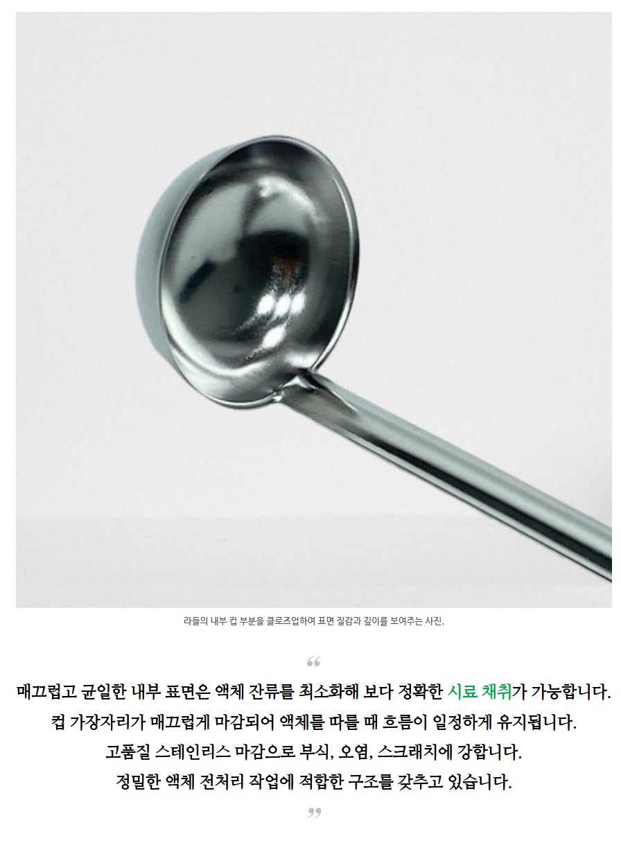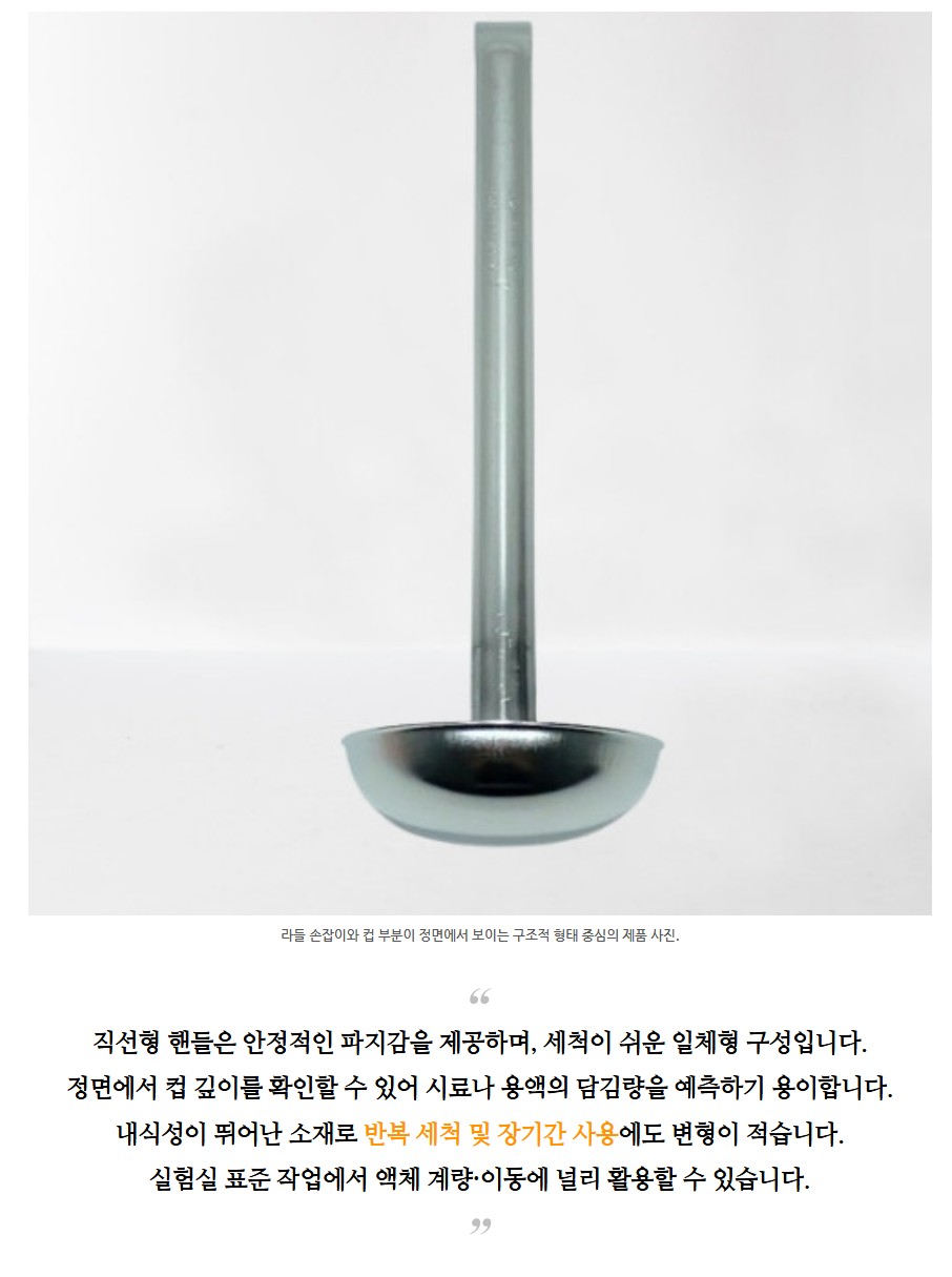 업소용, 가정용, 카페용 등 다양한 환경에서 활용되는 실용적인 스테인리스 계량 국자입니다.