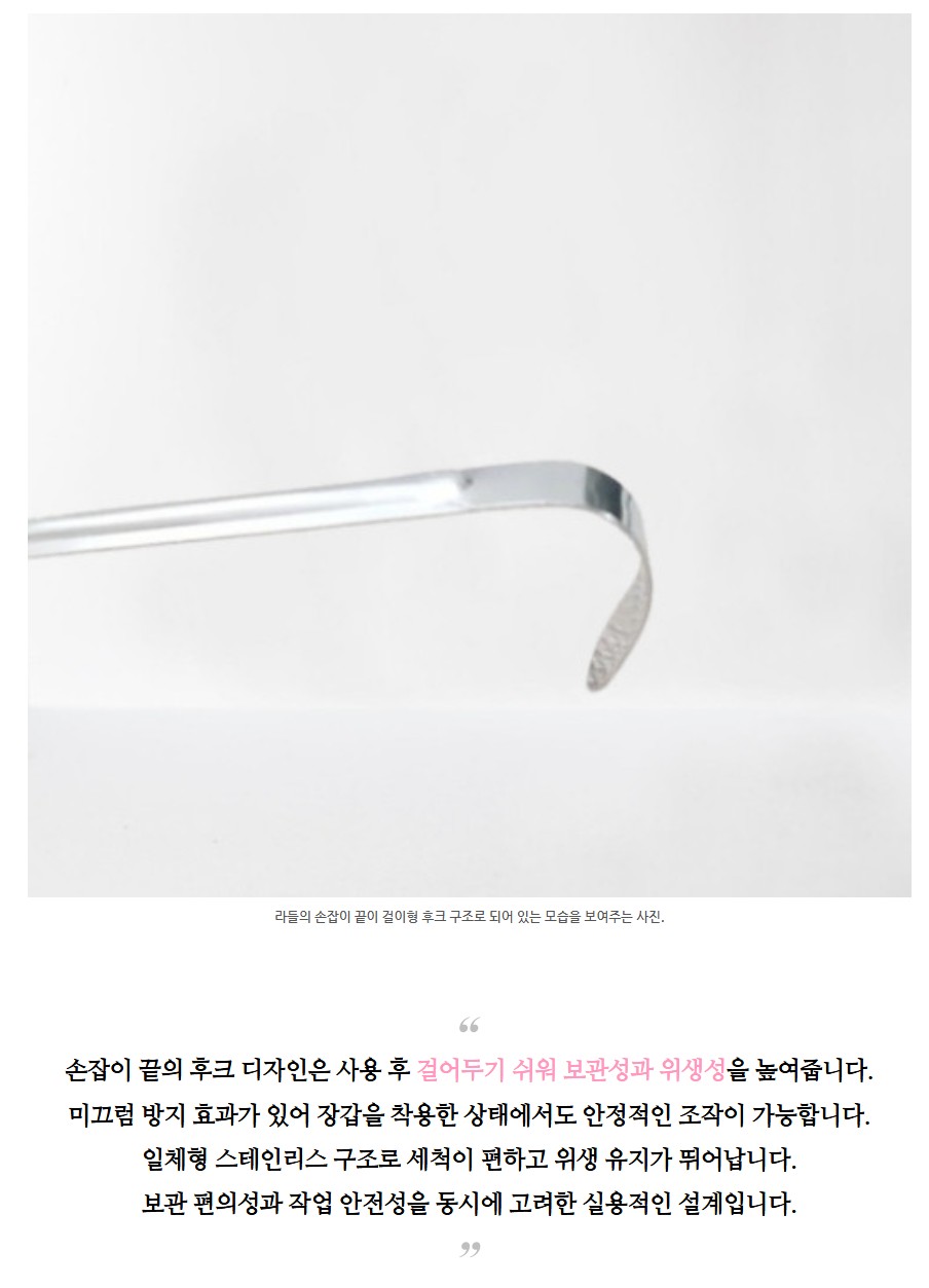 긴 손잡이 구조로 깊은 용기에서도 편리하게 사용할 수 있으며, 손잡이 끝의 고리형 디자인으로 보관 또한 쉽습니다.