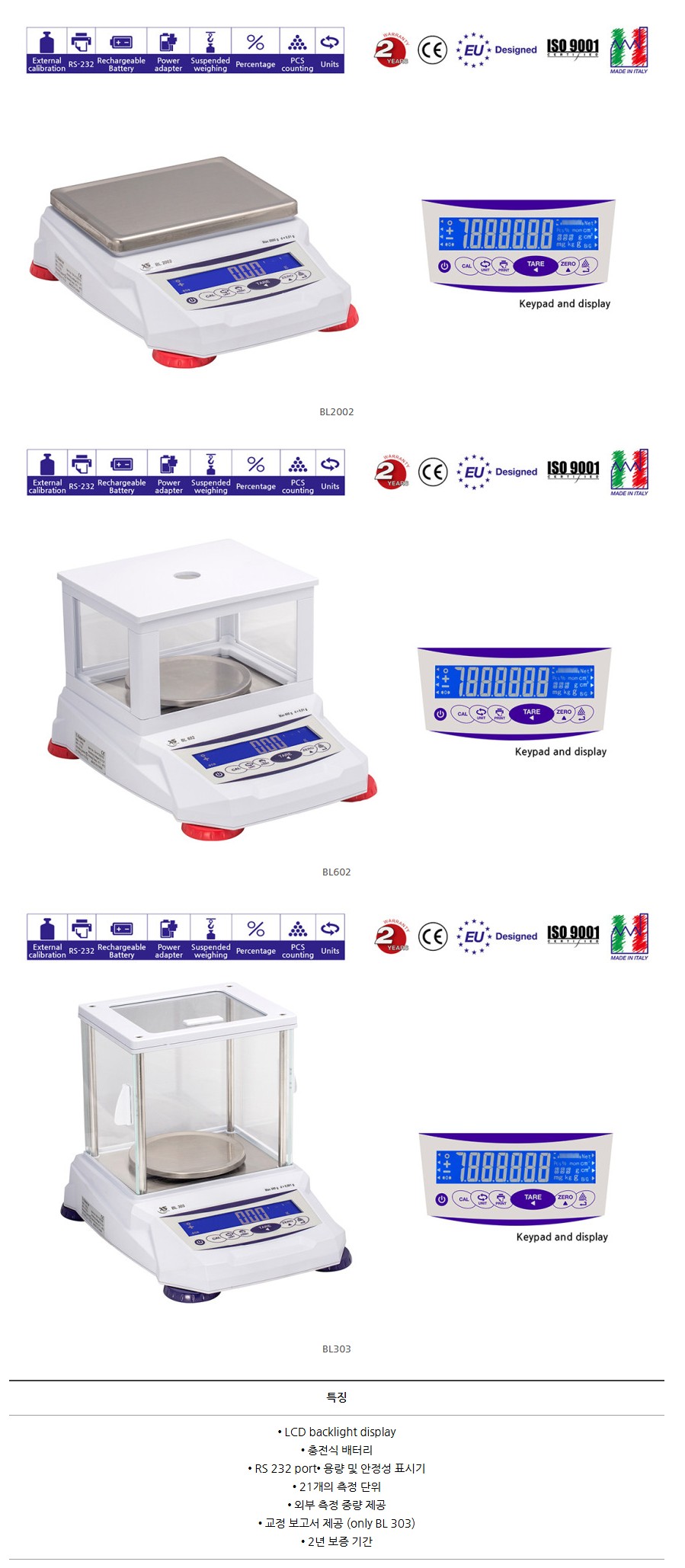 품명 분석용 정밀 전자저울 BL 시리즈. 0.001g~0.01g 정밀도, RS232 통신, 충전식 배터리, LCD 백라이트 탑재. 연구실 및 산업용 고정밀 계량기.