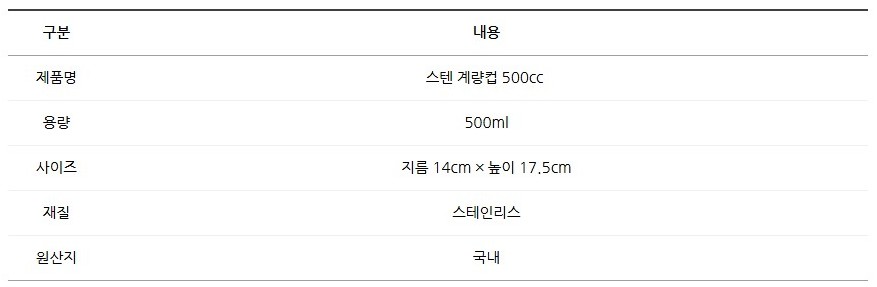 고급 스테인리스 소재로 제작된 500ml 계량컵은 내구성과 위생성이 뛰어나 오래 사용해도 녹슬지 않고 변색이 되지 않습니다.