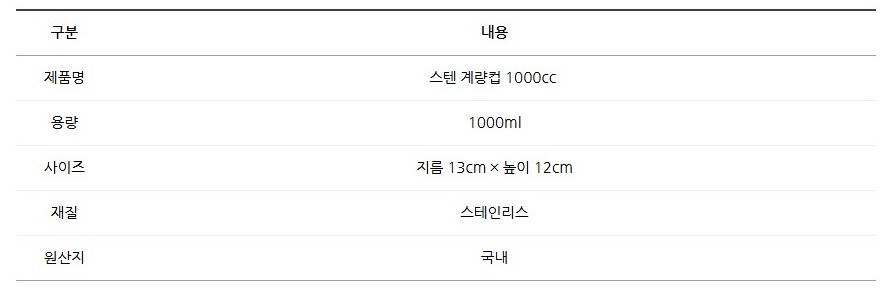 고급 스테인리스 소재로 제작된 1000ml 계량컵은 내구성과 위생성이 뛰어나 오래 사용해도 녹슬지 않고 변색이 되지 않습니다.