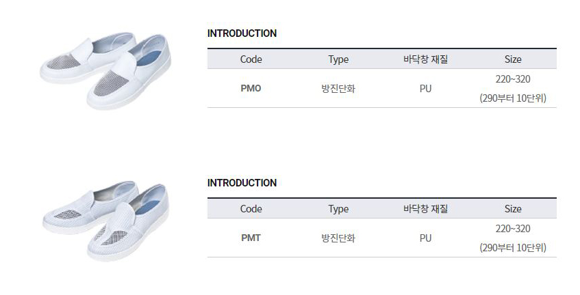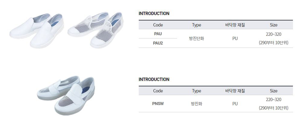 품명 크린룸에서 필수적으로 착용하는 부츠형 신발로, 발진성이 없는 폴리우레탄 밑창 또는 도전성 PVC 밑창을 사용합니다.