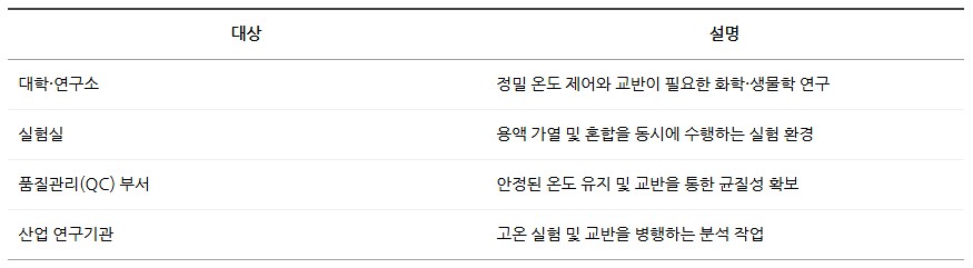 용액을 균일하게 섞어주어 온도 분포를 향상시키며, Compact한 디자인으로 공간 활용이 용이합니다.