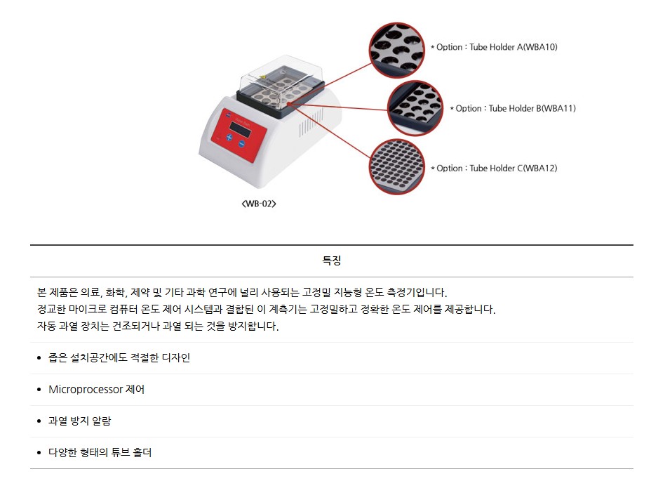 튜브 홀더 옵션(WBA10, WBA11, WBA12)으로 다양한 튜브 및 바이알 실험에 최적화되어 있습니다.