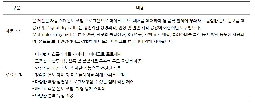 품명 Digital Dry Bath DB-02는 PID 제어로 정확하고 안정적인 온도 조절이 가능한 실험실 장비로, 생명과학·화학 연구에 최적화된 제품입니다.