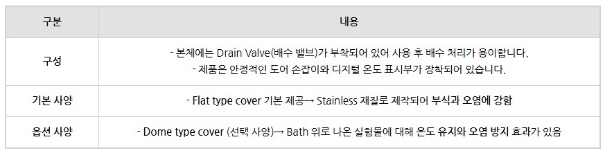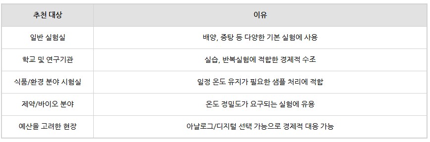 품명 일반 항온수조 시리즈 디지털 및 아날로그 타입으로 선택 가능하고 SUS304 위생적 재질로 실험에 적합합니다.