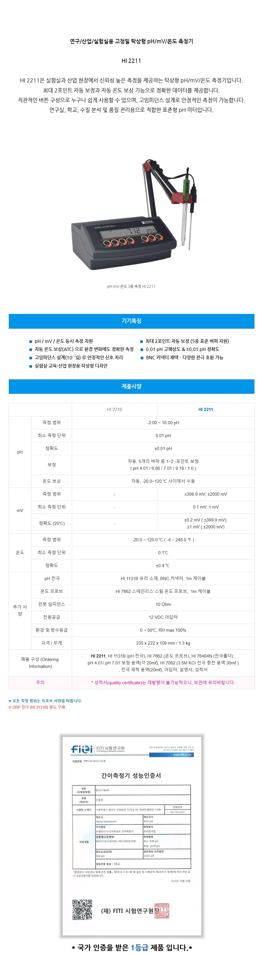 품명 연구/산업/실험실용 고정밀 탁상형 pH/mV/온도 측정기 HI 2211