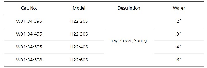 Tray, Cover, Spring으로 구성되어 웨이퍼를 안정적으로 고정하며, 2~6인치 다양한 사이즈에 대응합니다.