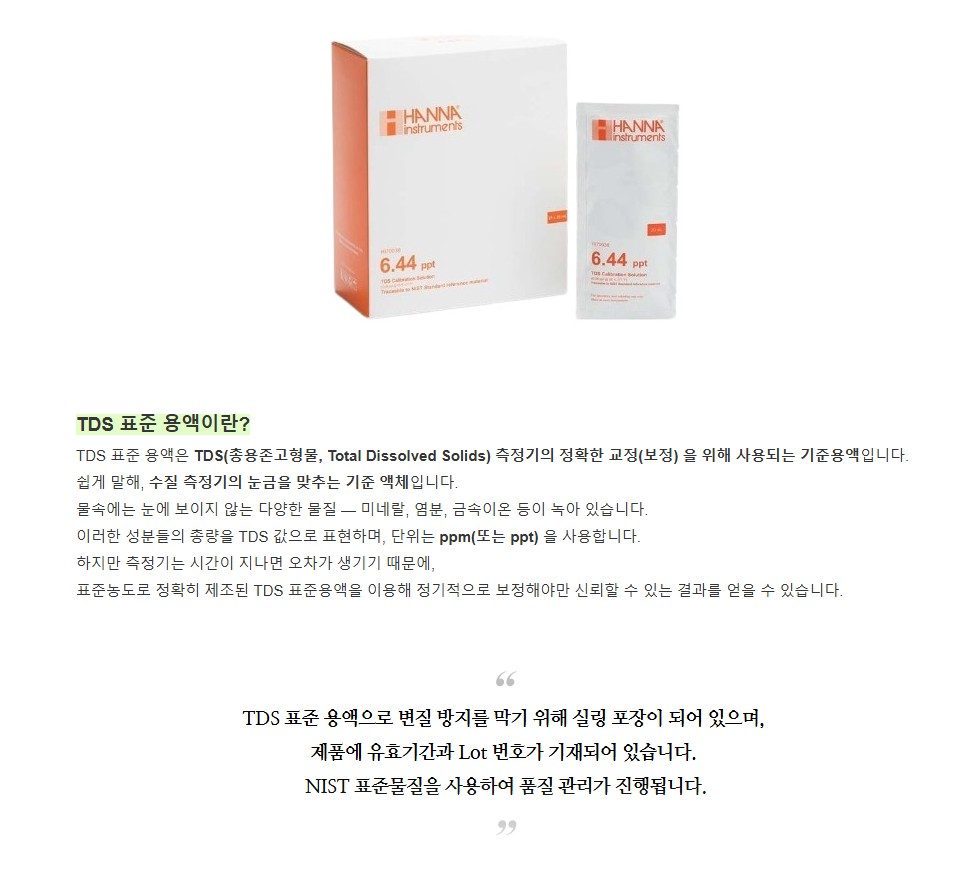 품명 NIST 표준물질 기반 HI70038P TDS 표준용액 6.44ppt, 실링 개별포장으로 변질 방지 및 정확한 수질 측정 교정에 최적