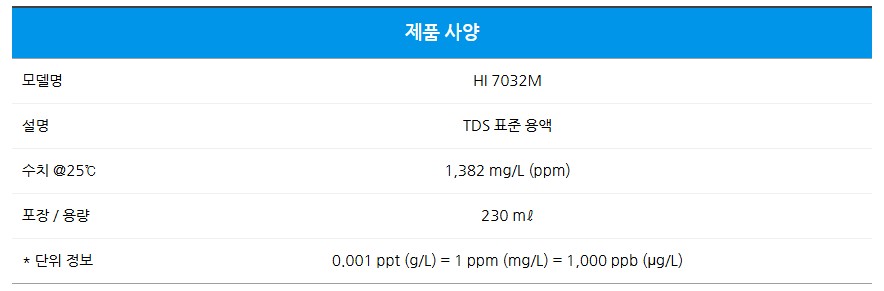 품명 HI7032M TDS 표준용액은 1382ppm 농도로 제작된 고정밀 교정액으로, 실링 포장 및 NIST 표준물질 기반으로 안정적인 교정 품질을 제공합니다.