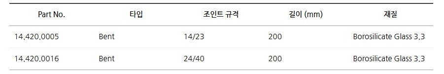 품명 곡형 가스 투입관은 실험 장치에 가스를 주입하거나 유리관을 연결할 때 사용하는 90도 곡형 구조의 튜브로, Borosilicate Glass 3.3 소재로 제작되어 내열성과 내화학성이 우수하며 14/23 및 24/40 조인트 규격에 호환됩니다.