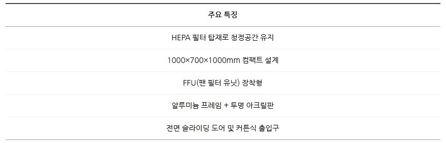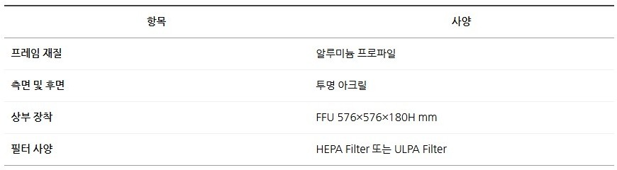 내부에 고성능 HEPA 필터 탑재형 FFU (Fan Filter Unit) 가 장착되어 있어