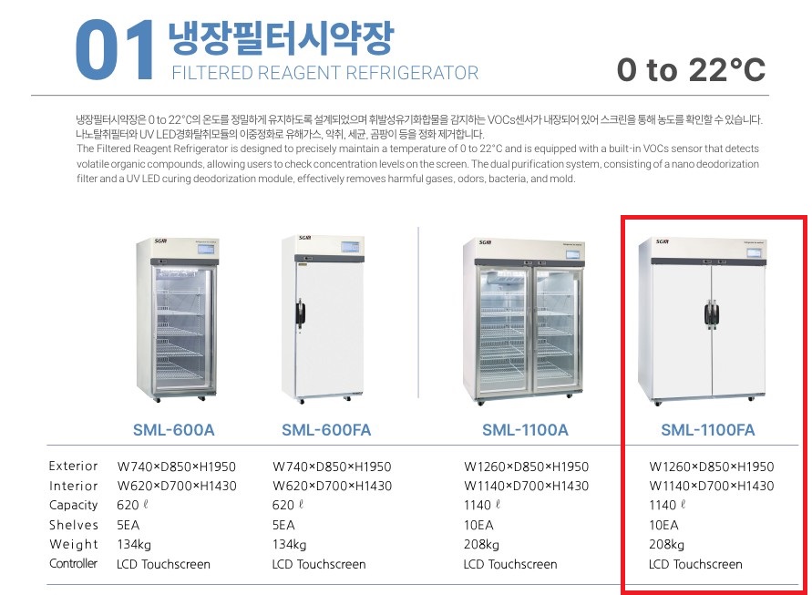 냉장 필터 시약장 자체정화식밀폐형 자외선 살균 시약장 SML-1100FA (1140L)