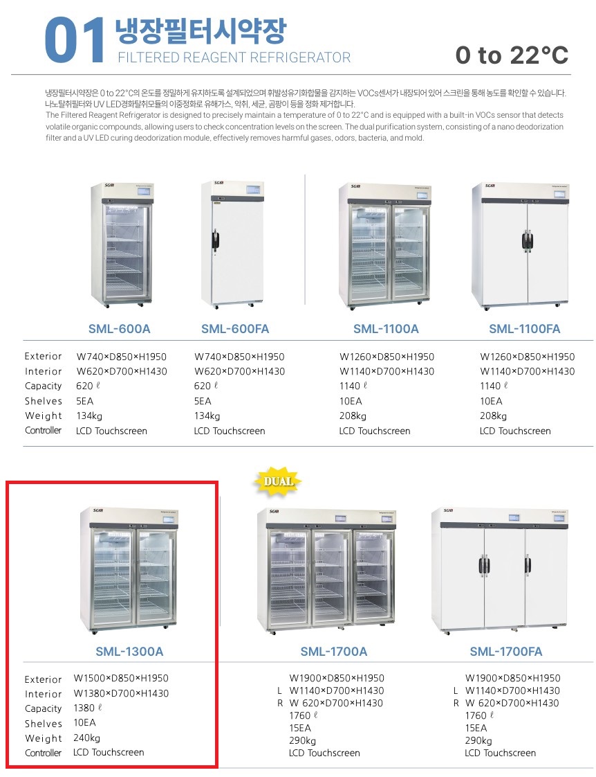냉장 필터 시약장 의약품 냉장고 대용량 약품 UV LED 살균 냉장 보관장치 SML-1300A (1380L)