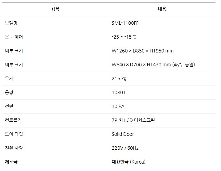 품명 SML-1100FF 실험실 냉동고, -25℃~-15℃ 온도 제어, 1080L 대용량, 7인치 LCD 제어기와 안전장치 탑재, 연구소·제약기업 필수 장비.