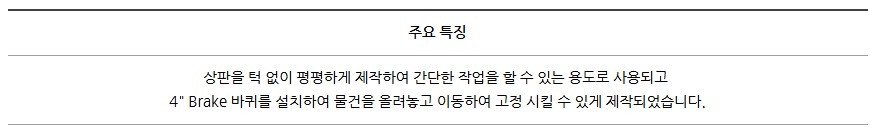 이 제품은 상판을 평평하게 제작하여 간단한 작업대 또는 물건을 올려놓고 이동할 수 있는 이동식 카트형 작업대입니다.