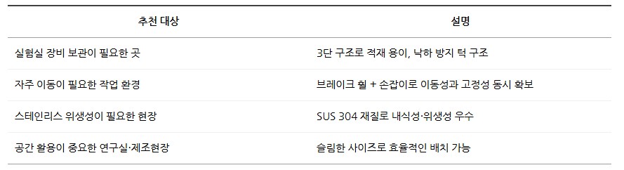 실험실, 창고, 제조현장 등 다양한 공간에서 유용하게 사용할 수 있습니다.