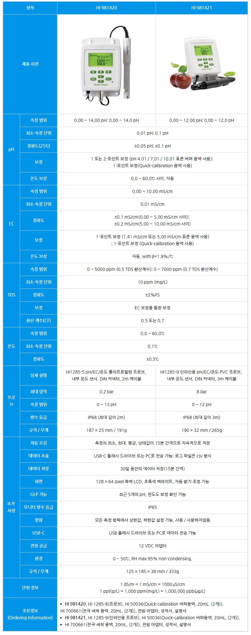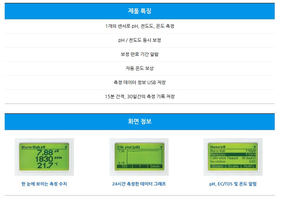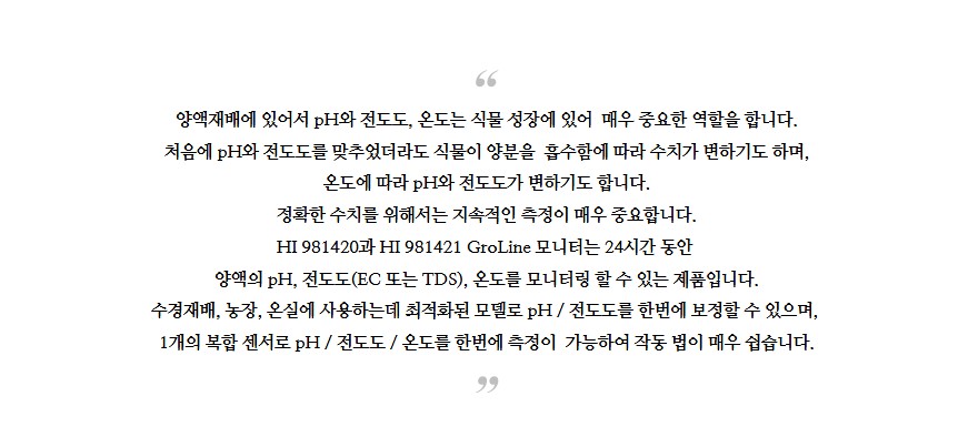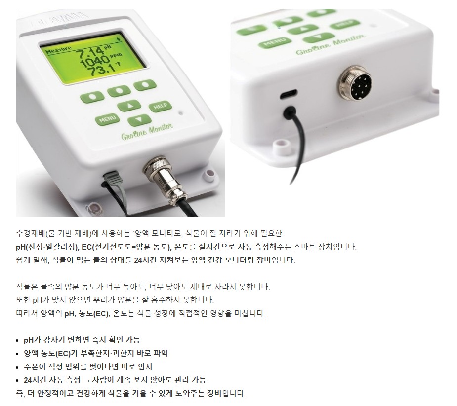 품명 pH·EC·온도를 실시간 모니터링하는 수경재배 전용 측정기입니다. 자동 온도 보정, 데이터 저장, USB 연결 기능을 갖춘 양액 관리 최적 모델입니다.