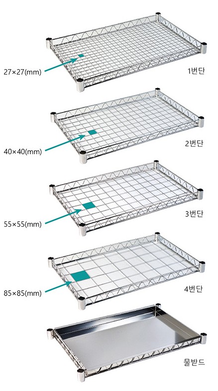 ?초자 건조대용 선반 구성 ? 망 간격별(27~85mm) 4단 선반과 스테인리스 물받이로 다양한 실험기구에 맞춰 사용 가능.
