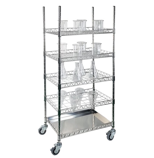 ?SUS304 스테인리스 소재의 5단 초자 건조대 ? 다양한 유리기구를 안전하게 건조 및 보관할 수 있는 실험실 전용 이동식 랙.