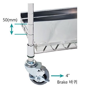 ?4인치 브레이크 바퀴와 50mm 높이의 스테인리스 물받이 ? 안전한 이동과 효율적인 물기 배출을 지원합니다.