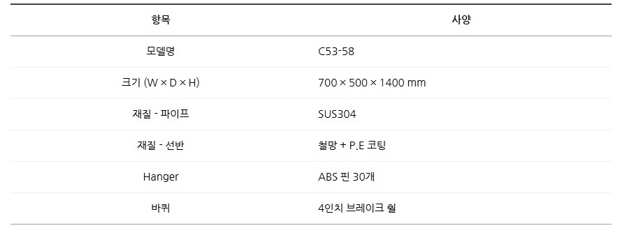 내구성이 뛰어난 SUS304 파이프 프레임과 철망 선반 구조, 4개의 바퀴로 편리한 이동이 가능하며,