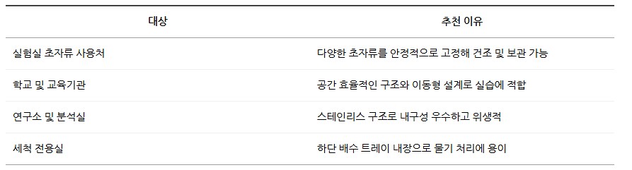 좁은 공간에서도 많은 양의 실험용 초자류를 효율적으로 보관·건조할 수 있도록 설계된 드라잉랙입니다.