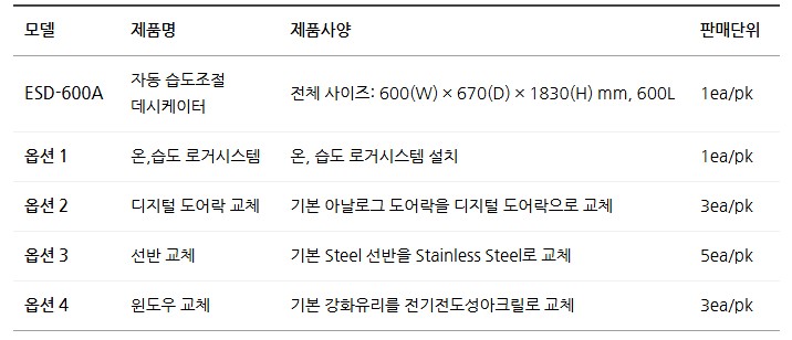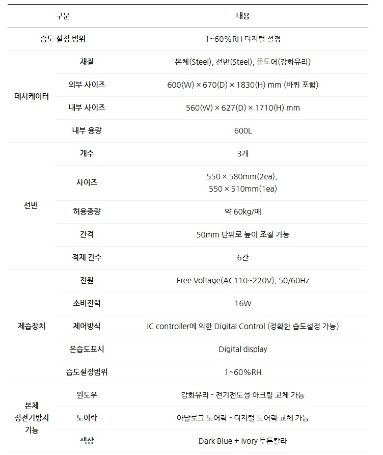 ESD-600A는 상·중·하 3단 도어 구조로 설계된 대용량 자동 습도조절 데시케이터로,