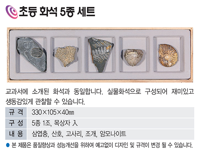 초등 화석 5종 세트는 교과서에 등장하는 대표 화석을 실물 그대로 구성하여