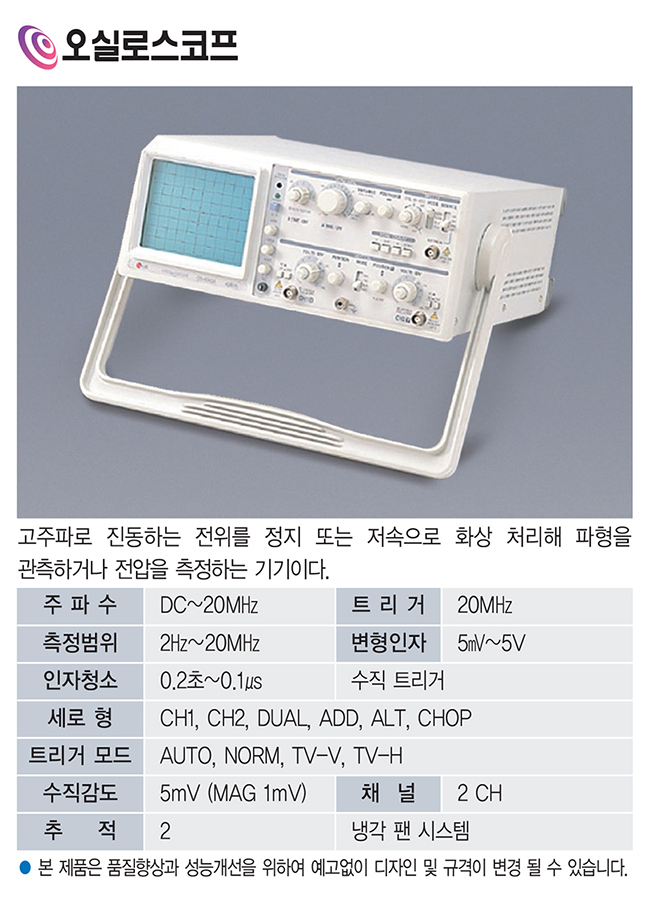 품명 DC~20MHz 주파수와 2채널 입력을 지원하는 오실로스코프로 파형 관찰과 전압 측정에 적합하며 다양한 트리거 모드와 수직감도를 제공해 실험 및 교육 현장에서 활용도가 높습니다.