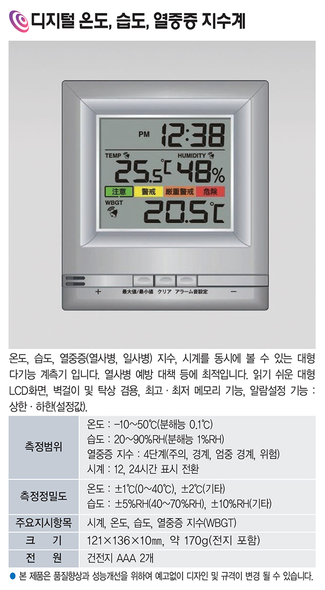 품명 온도·습도·열중증 지수와 시계를 한 화면에서 확인할 수 있는 대형 LCD 지수계로, 열사병 예방과 실내 환경 관리에 유용하며 벽걸이·탁상 겸용으로 활용도가 높은 제품입니다.