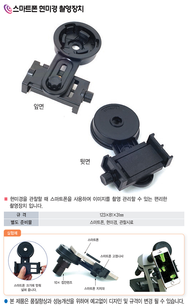 품명 스마트폰 현미경 촬영장치는 현미경 관찰 화면을 스마트폰으로 안정적으로 촬영할 수 있는 어댑터로, 실험 이미지 기록과 교육용 영상 제작에 적합한 실험실 필수 보조장비입니다.