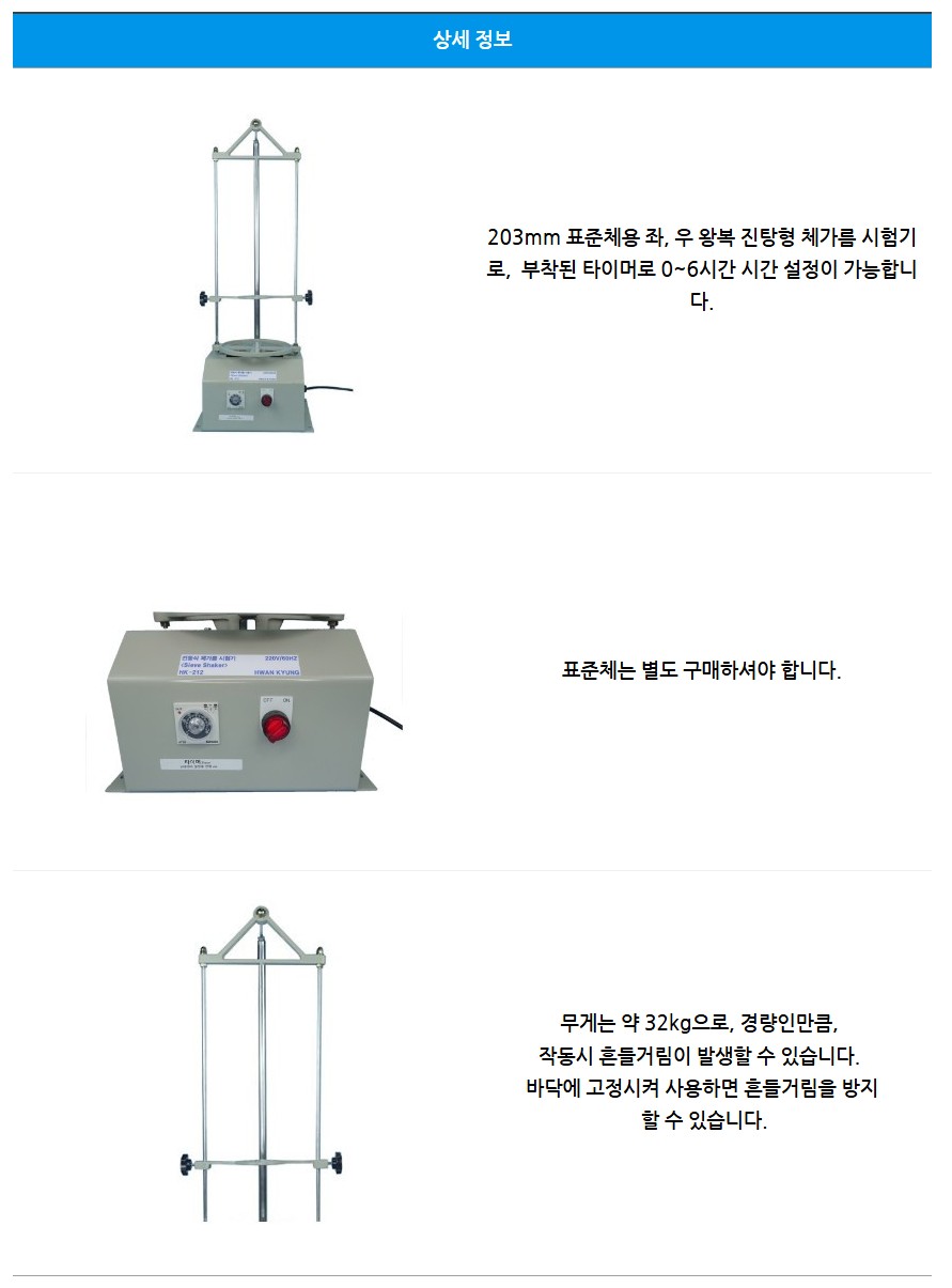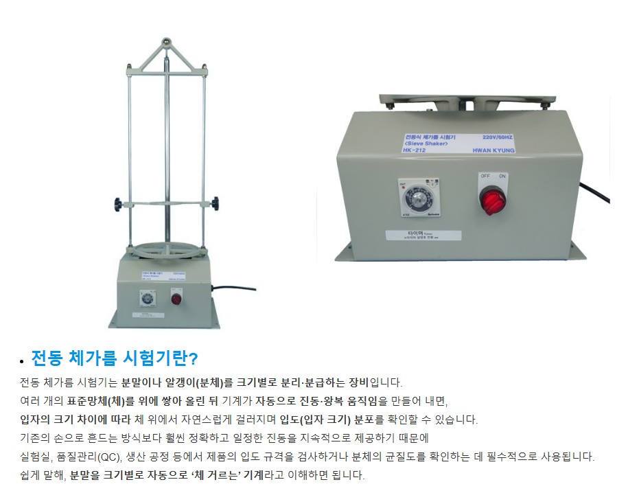 품명 전동 체가름 시험기는 203mm 표준체를 사용해 분체 입도를 자동으로 분리·분급하는 모터식 장비로, 좌·우 왕복 진동과 0~6시간 타이머 설정이 가능해 실험실·산업용 입도 분석에 적합한 제품입니다.