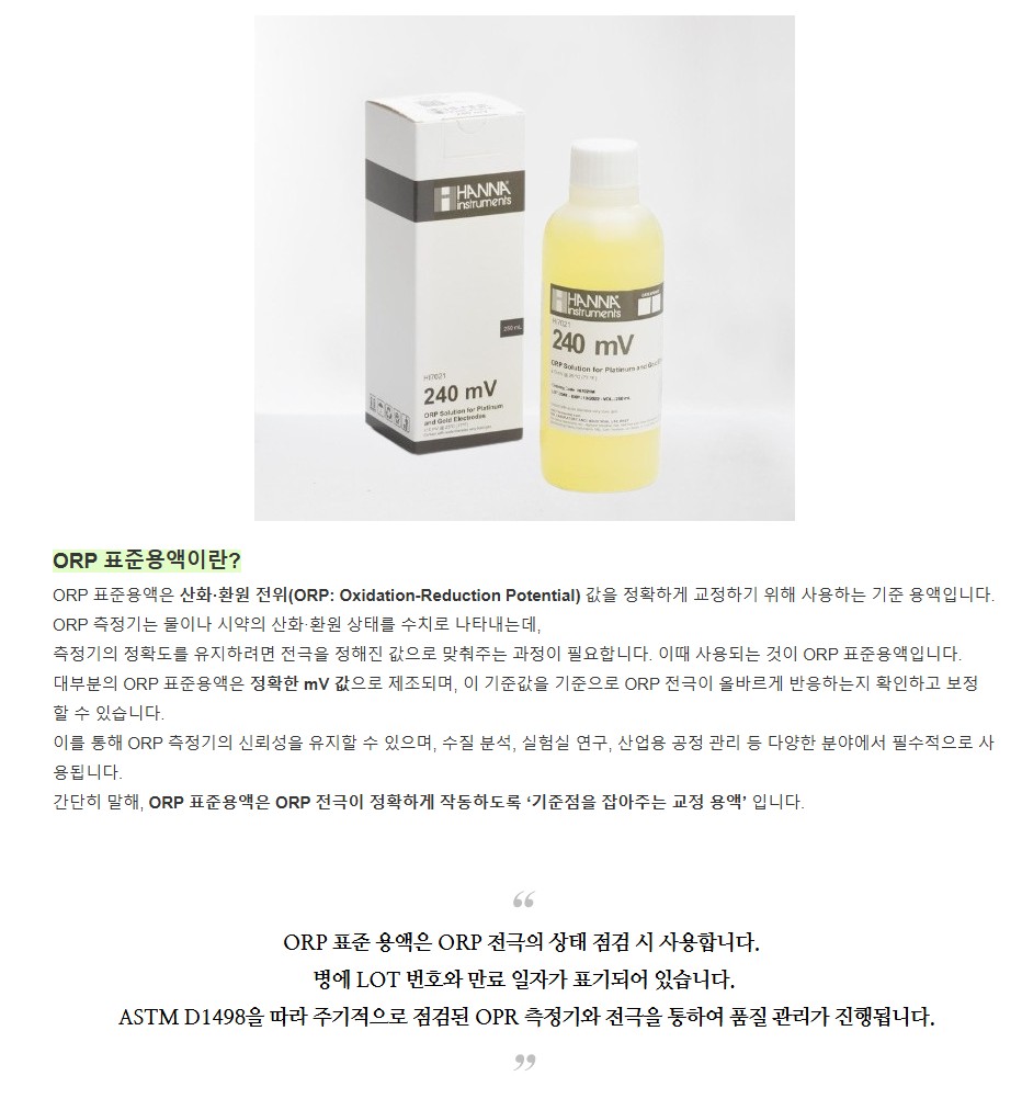 품명 HI7021M ORP 표준 용액은 240mV 기준으로 ORP 전극 점검과 교정에 사용되며, LOT 표기와 ASTM D1498 기준으로 관리되는 230mL 제품입니다.