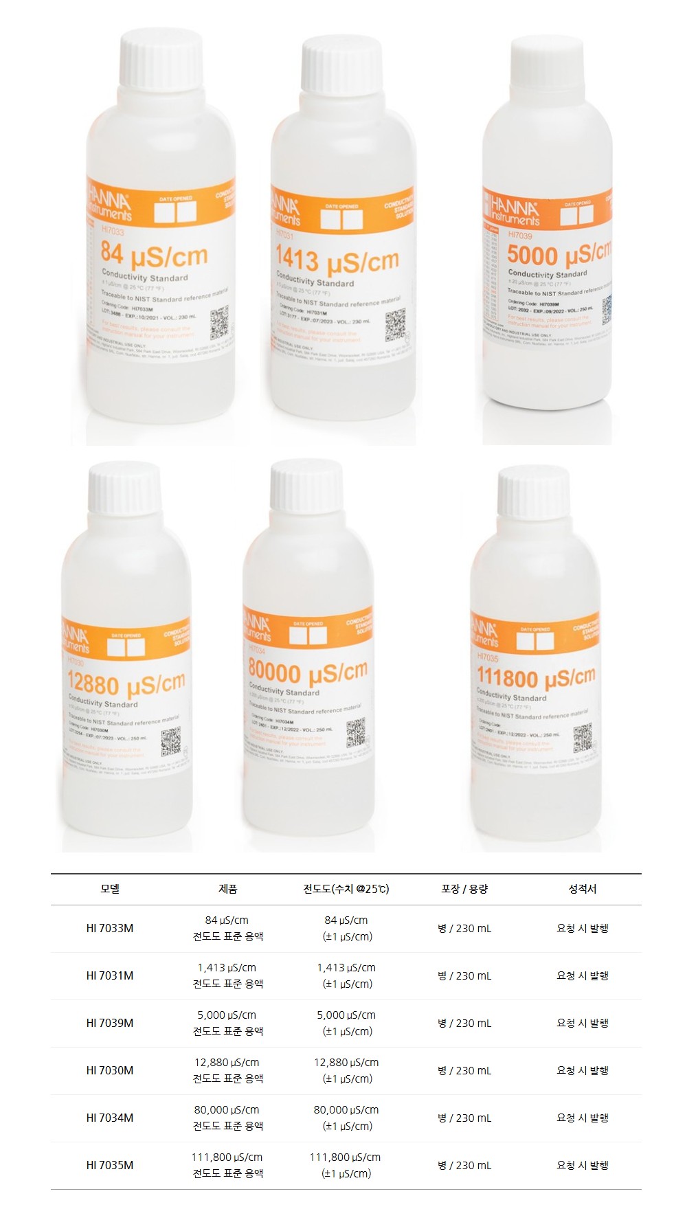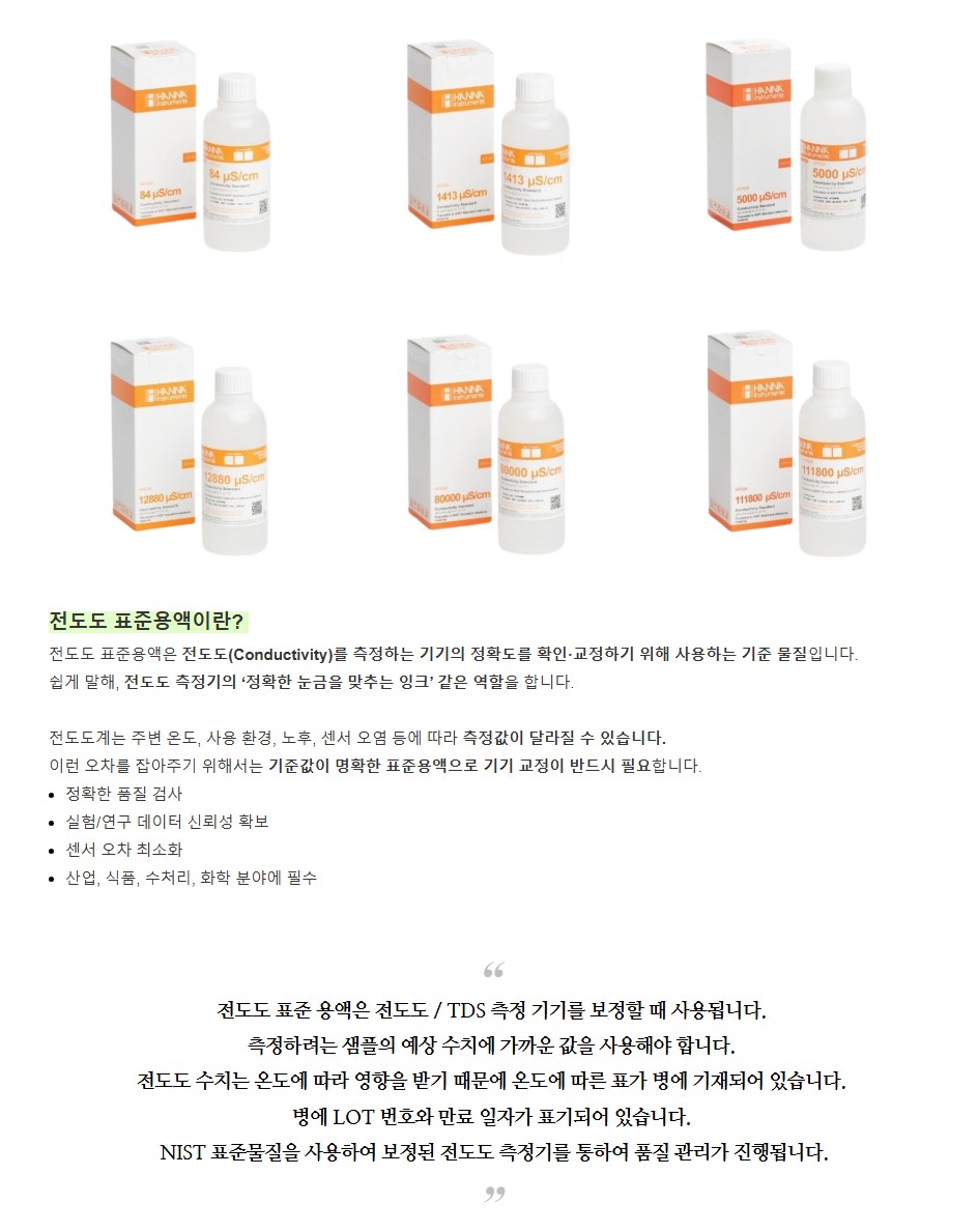품명 전도도 표준용액 시리즈는 전도도·TDS 측정기의 정확한 보정을 위한 고정밀 표준액으로, NIST 기반 품질관리와 온도 보정표가 포함된 신뢰도 높은 교정 솔루션입니다.